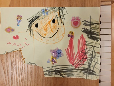 お写真は、4歳の女の子のお友達が描いてくれた「ピアノレッスンの絵」です。