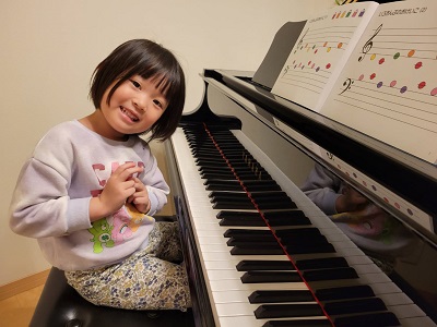 4歳の女の子が、色音符楽譜を見ながら、グランドピアノを弾けるようになりました。